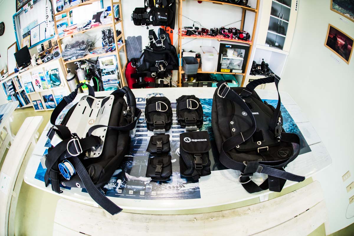 器材準備ではBCD・レギュレータ・タンクの充填確認、フィンやマスクの貸し出し、ダイブプランの共有を行います。
